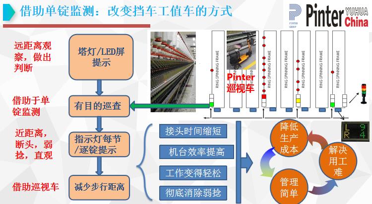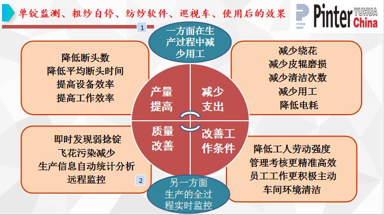 工作環(huán)境和勞動強度的改變:使工作變的輕松,提高工人積極性,改變招工難的現(xiàn)狀。飛花減少,一方面有利于紗線質量,另一個方面減少污染,環(huán)境得以改善,飛花減少,減少清潔次數(shù),增加車間的潔凈度。減少擋車工及保全工,降低用工成本。