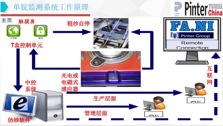 單錠監(jiān)測系統(tǒng),包含錠子監(jiān)測模塊、粗紗自停裝置、能耗模塊、牽伸模塊、效率模塊、照明控制模塊、T盒控制單元、中控系統(tǒng)等,其中每個模塊都包含監(jiān)測單元、執(zhí)行或顯示單元,用戶可根據(jù)需求選擇。尤里卡紡紗軟件,通過主服務器,收集、記錄各個子系統(tǒng)的實時數(shù)據(jù),并將數(shù)據(jù)進行整理和分析后,分別提供給管理人員、操作人員和維護人員等。