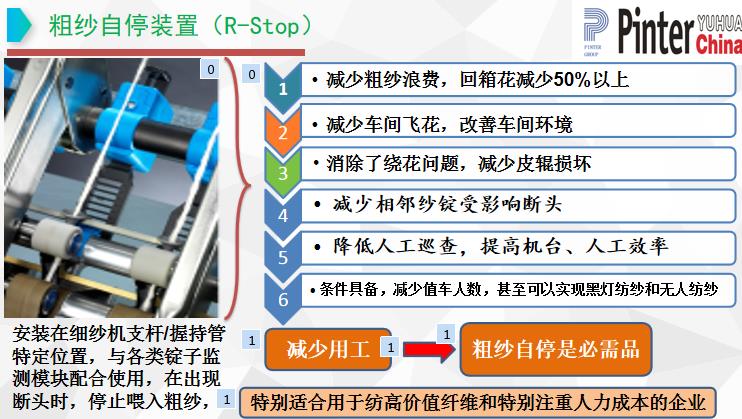 降低用工成本:監(jiān)測到斷頭可即時打斷粗紗,停止喂入,減少粗紗浪費。由于即時停止粗紗喂入,減少回花,廢棉明顯降低。降低膠輥、皮圈和羅拉的維護:粗紗自停裝置及時停止粗紗喂入,避免了纏繞,降低對膠輥、皮圈、羅拉的損害。減少擋車工及保全工,降低用工成本。